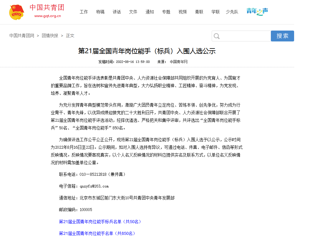 近日,共青團中央公示了第21屆全國青年崗位能手(標兵)入圍人選,中建八局一公司公司員工張業(yè)、陳宇航榮獲“全國青年崗位能手”稱號。